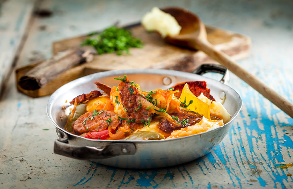 Χαρακτηριστικές είναι οι μακριές, γλυκιές πιπεριές και οι έντονες γεύσεις που έχουν τα χωριάτικα λουκάνικα, τα οποία χρησιμοποιούνται συνήθως. Στην Ελλάδα είναι γνωστά το σπετζοφάι Πηλίου.