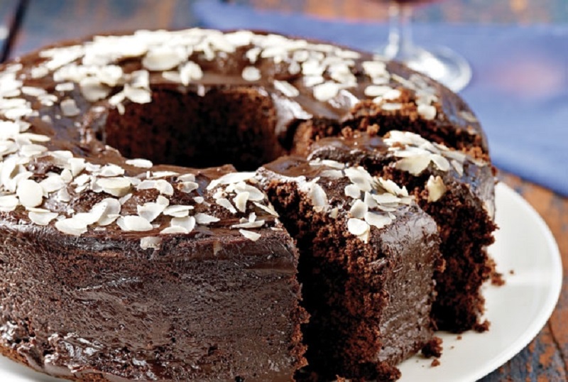 Για το γλάσο: Κομματιάζουμε τη σοκολάτα και τη βάζουμε σε κατσαρόλα. Προσθέτουμε την κρέμα γάλακτος. Σε πολύ χαμηλή φωτιά αφήνουμε να λιώσει και να ομογενοποιηθεί το γλάσο, ανακατεύοντας πότε πότε. Αφήνουμε λίγο το γλάσο να κρυώσει. Αφού τοποθετήσουμε το κέικ σε πιατέλα, το περιχύνουμε με το γλάσο του. Αν θέλουμε, πασπαλίζουμε αμύγδαλο φιλέ για γαρνίρισμα.